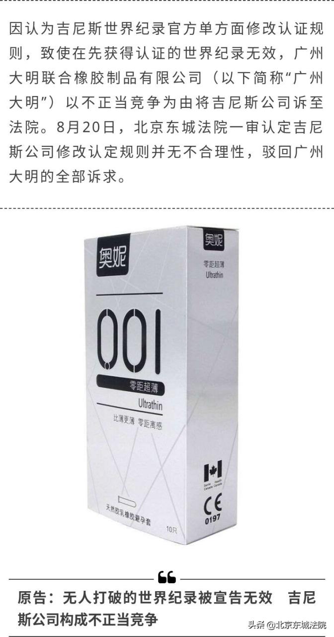 广州大明诉称,经其申请,被告吉尼斯世界纪录有限公司(以下简称吉尼斯公司)于2013年12月2日认证并向其颁发了吉尼斯世界纪录认证书,确认原告制造的奥妮超薄001天然橡胶乳胶避孕套为最薄的乳胶安全套,获得最薄的乳胶避孕套吉尼斯世界纪录(以下简称涉案世界纪录),且至今仍无人打破该纪录。