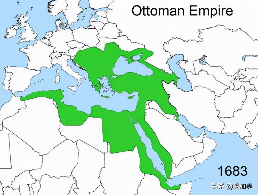 2、奥斯曼帝国(1299-1923)。奥斯曼人原为中亚的一个突厥小部族,在蒙古西征时被驱赶往西亚,后扩张成为横跨欧亚非三大洲的帝国(550万Km2,1683年),1923年崩溃后分裂为为40多个国家。
