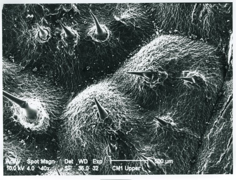 除了物理伤害,毛刺还会对人体进行化学攻击。植物学家还不确定毛刺里的毒素成分具体是什么,但在毛刺中发现了二氧化硅、碳酸钙和磷酸钙。毛刺里的毒素稳定且耐热,可以在几十年内维持性状,100多年前收集的金皮树标本上的毛刺,依然能够让人感受到刺痛感。