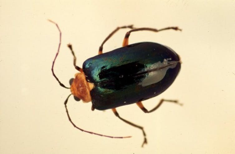 不过有的动物却敢直接吃叶片。植物学家们观察到,金皮树的叶片上经常会有很多洞,是啃食后造成的。2018年,他们终于观察到了吃金皮树树叶的生物。他们在金皮树的叶片上发现了数十只夜行性食叶的菊科甲虫,还观察到了红腿帕德梅隆食用金皮树叶。
