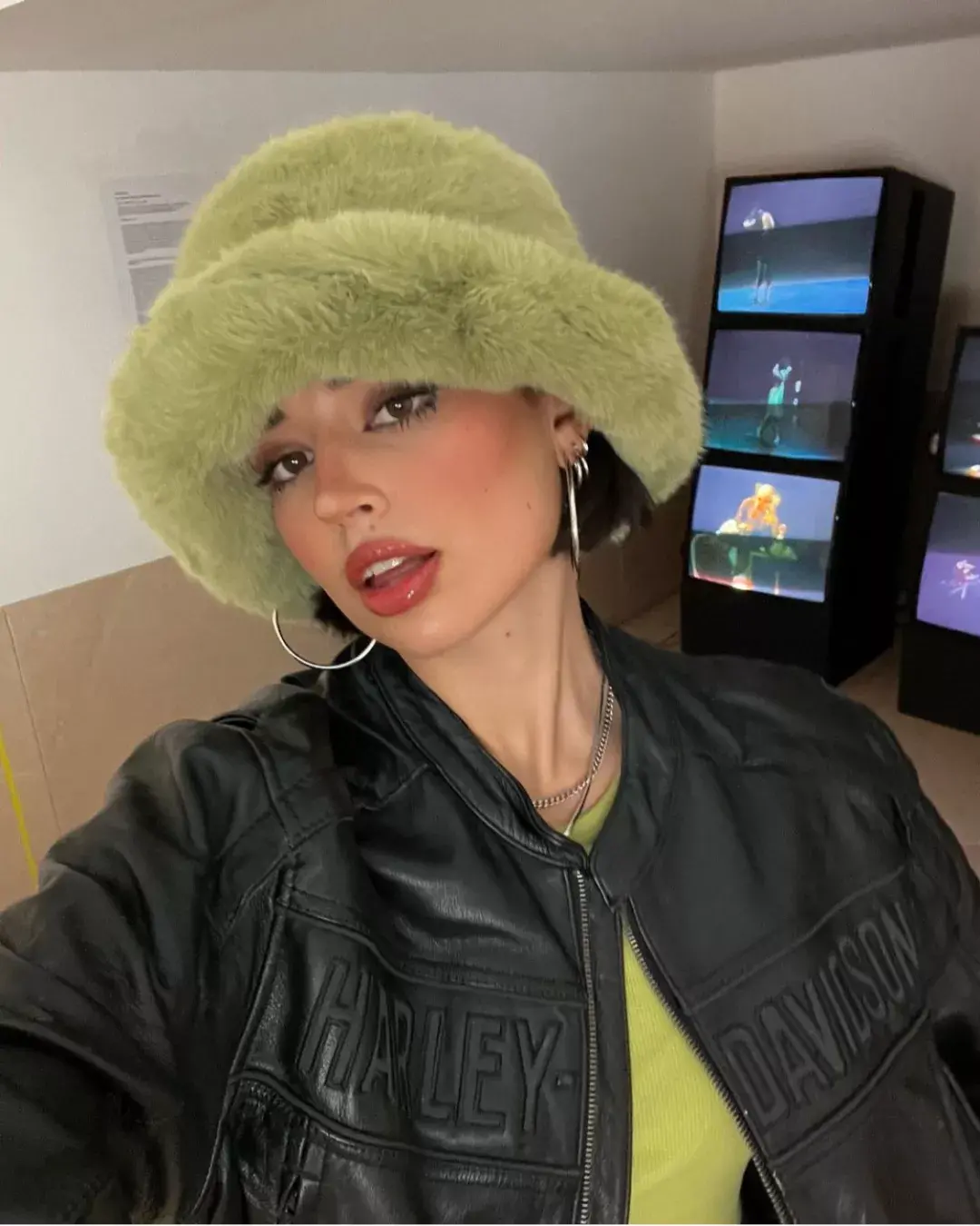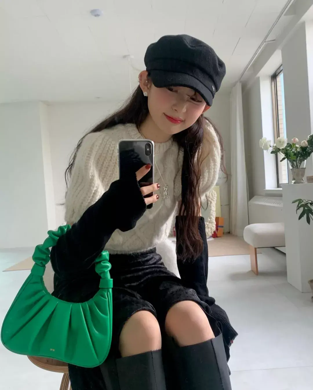 渔夫帽本身就不挑脸型,稍有些宽松度,头发再挡一挡,收脸效果一绝。