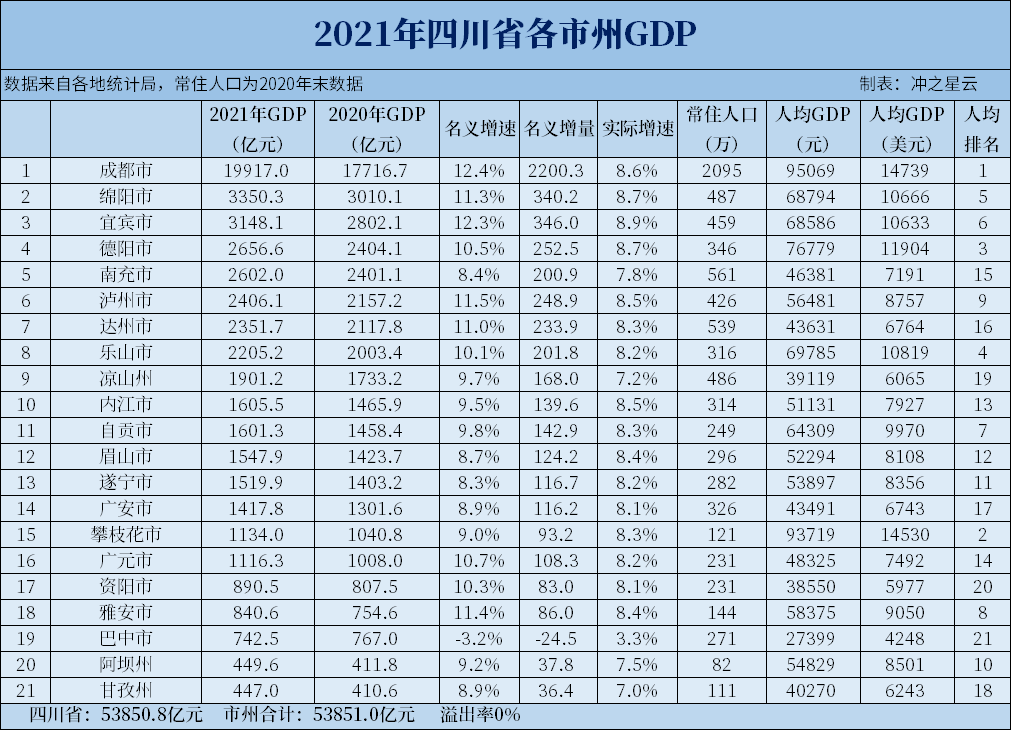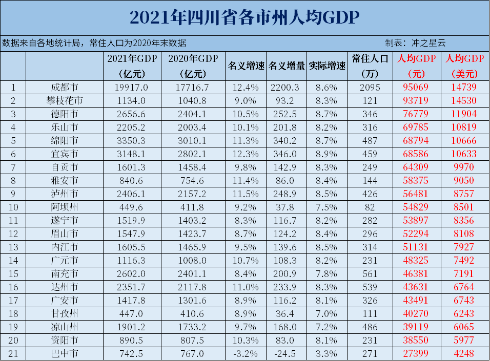 从人均GDP来看,各市排序为成都、攀枝花、德阳、乐山、绵阳、宜宾、自贡、雅安、泸州、阿坝州、遂宁、眉山、内江、广元、南充、达州、广安、甘孜州、凉山州、资阳、巴中。其中6个人均超过1万美元,1个(巴中)不足5千美元。人均最高的成都是最低巴中的3.47倍。