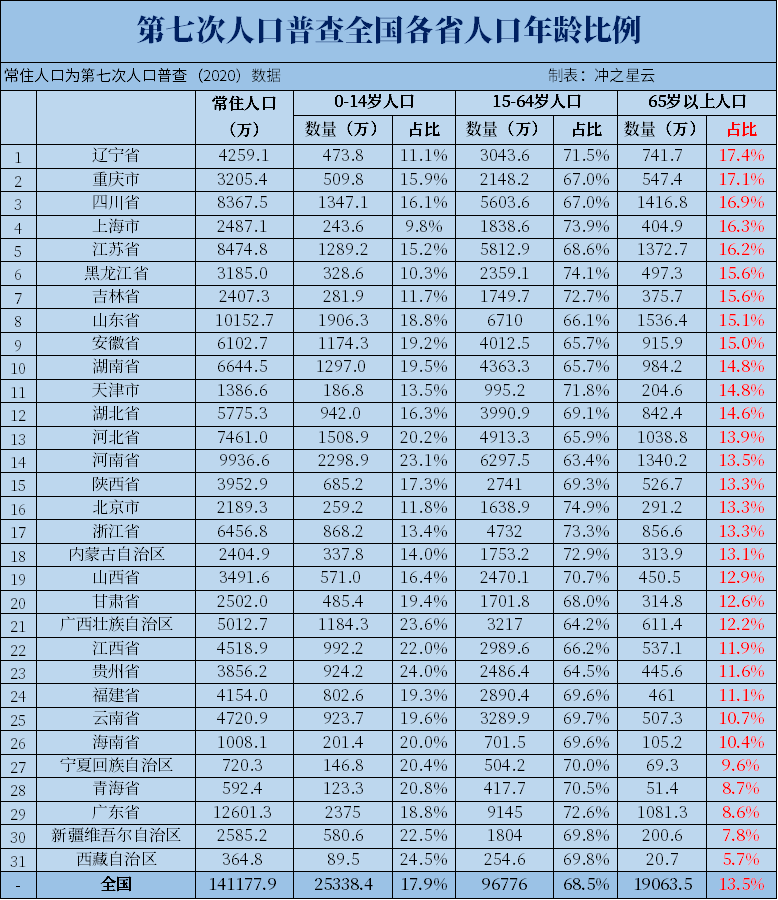 分省来看,在2010年我国65岁以上人口占比超过10%的省,共有6个;而在2020年,65岁以上人口占比低于10%的,只剩下5个省了。老龄化程度最深的辽宁省,65岁以上人口占比已经高达17.4%。