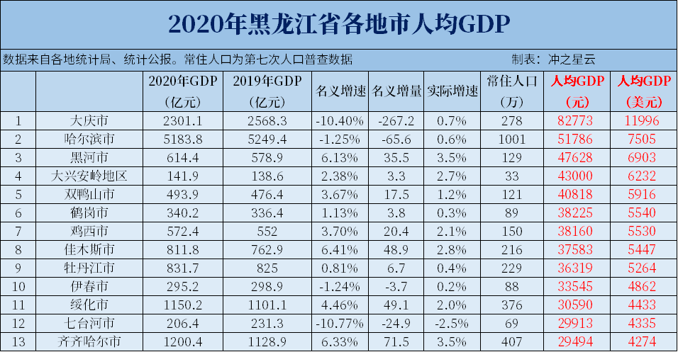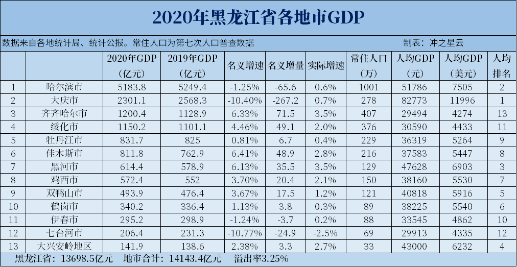 传统上,黑龙江的城市有“哈齐牡佳大”的说法,对应车牌号黑A-黑E,反映了当年城市档次的排序。如今,在2020年的GDP总量排序中,上述5城仍可排到前6位,只不过顺序稍有变动。