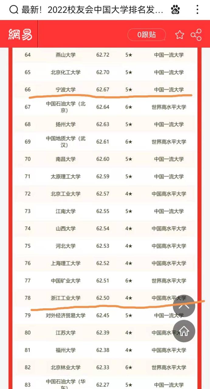 今天看到国内四大排行榜(武大、武书连、校友会、软科)之一的最新大学排名,发现宁波大学上升非常明显,史无前例的达到最高的66名,比去年上升了2位。这确实让我等宁大师生为之振奋,但欣喜之余,似乎又觉得有些意外,甚至还有少许担心。宁大这次排名超过了中国石油大学、中国地质大学、北京工业大学、福州大学、太原理工、江南大学等一批老牌211高校。在浙江省内排名在第二位,比浙工大(78位,比去年下降2位)整整超了十二名。也比一些老牌省部属重点大学,如扬州大学、江苏大学等排名高。这样的好消息,相信学校的网站头条里一定会好好地宣传一下。个人拙见,学校上层领导应该还是能客观看待此排名的,也一定会看清和上述排名“不如宁大”的211或省部属重点高校差距。我等宁大人不可对此排名太当真,沾沾自喜,误认为自己已经发展很好。