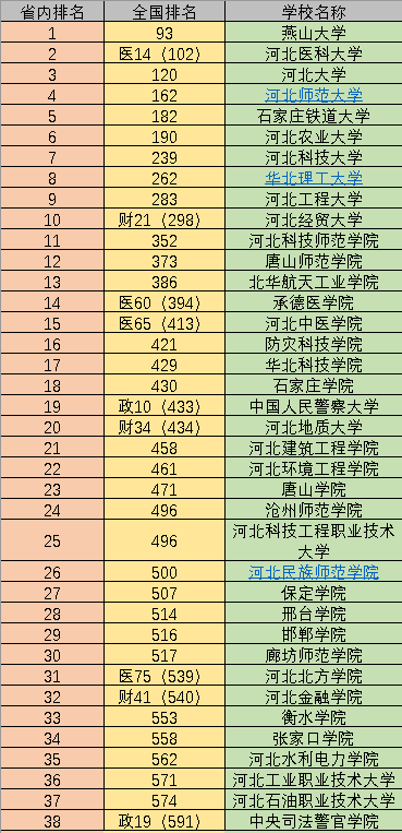 2022年软科高校排名公布,河北省内38所院校入选,从下图我们便能得知具体排名:燕山大学排名第一、河北医科大学排名第二、河北大学排名第三、河北师范大学排名第四。