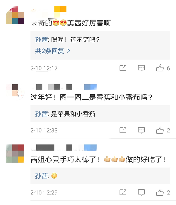 孙茜的高超厨艺也引人赞叹,她制作的糖葫芦卖相不错,一看就很好吃的样子,不少网友都纷纷向她请教食材还夸她心灵手巧,孙茜也和大家一一互动,气氛一片和谐。