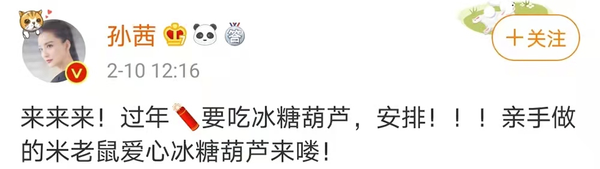 2月10日,曾出演过《甄嬛传》槿汐姑姑的演员孙茜在社交平台上高调秀厨艺,还配文:来来来!过年?要吃冰糖葫芦,安排!!!亲手做的米老鼠爱心冰糖葫芦来喽!