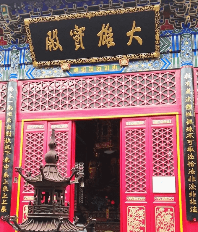 步入门洞,发现这归元寺的布局与我们常见的寺院布局有所不同。通常中国的佛教寺院布局多采用“伽蓝七堂制”,即:山门——钟鼓楼——天王殿——大雄宝殿——本寺主供佛殿——藏经阁——方丈室等主体建筑,而且多为坐北朝南布局。而武汉归元寺它最正中的是大雄宝殿,南侧为罗汉堂,北侧为藏经阁,不仅呈现横排布局,而且主殿坐西朝东,给人一种横宽竖窄的感觉。