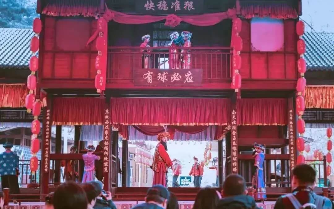 演出内容:锦里沟土家族传统婚俗包含对歌或抛绣球、认亲、订亲、合八字、娶亲等多个繁琐而复杂的步骤,其中娶亲是最核心的部分,有着众多的规矩,需经过“哭嫁”“迎亲”“发亲”“回门”等多项仪式,热闹喜气的演出向观众展现了原汁原味的土家族传统婚俗,还可以体验一把当土家女婿的乐趣!
