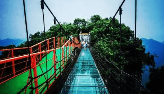 又名玻璃桥,桥径跨21米,是将原悬索吊桥的铁板换上了透视度高的钢化玻璃板,行走在上面,游客可以清楚的看见自己的倒影,透过玻璃还可以看见脚底下的万丈深渊,站在得乐桥的桥头,清秀的山和两旁的钢索都倒映在桥面上,也是一道风景。