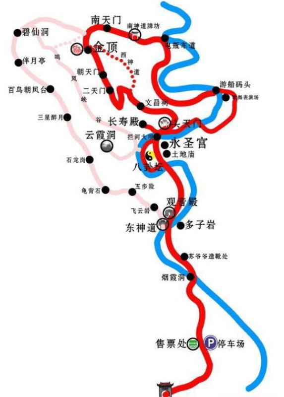 景区内主要景点有:烟霞洞、尘寰蓬岛、刑部苏爷爷遗靴处、60米太极图、云霞洞、永圣宫旧址、南天门、赵公台、明月阁、青凤亭、打鼓洞、南岩宫、太阳宫等四十多处。