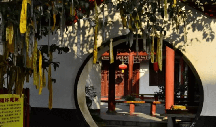 “文昌阁”,院内有一颗长势茂盛的树,叫“祈福许愿树”。树下的牌子上是这么记载的:“此树名女贞树,为张居正幼时亲手所栽。