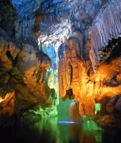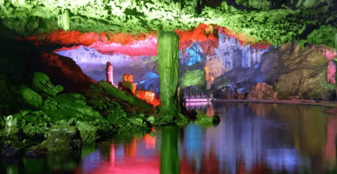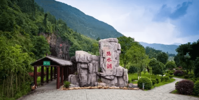 “神奇隐水洞,十里水画廊”。隐水洞景物如玉琢精雕,洞中仙境惟妙惟肖;潺潺流水,碧潭清澈,轻舟荡漾,飘飘欲仙;宏大的钟乳群体造型别致,在荧光闪烁下流光溢彩,华丽胜似天宫。