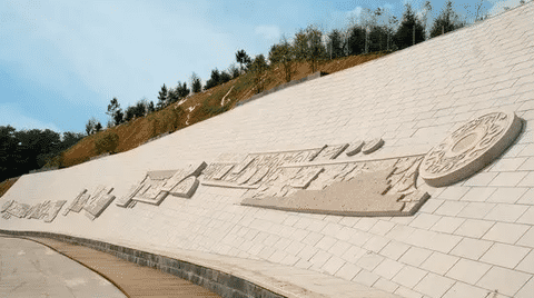 展现人类在蒙昧时代混沌状况的文化墙,石板上雕刻几何抽象图案的浮雕为原始象形文字。