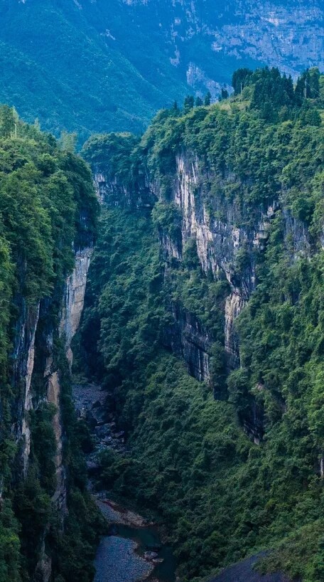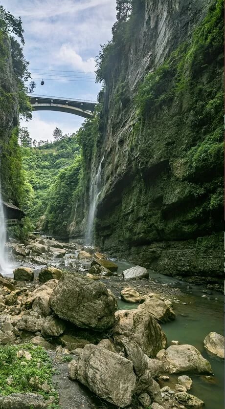 大峡谷内的云龙河地缝怪石遍布,五彩斑斓,古木苍翠,尤其是地缝两岸的数条飞瀑流泉,令人震撼而神怡。