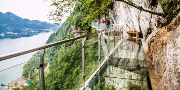 望仙崖悬崖栈道全长1080米,分为玻璃栈道和钢筋混泥土栈道,其中玻璃栈道最高落差280米,最低180米,宽1.5米。