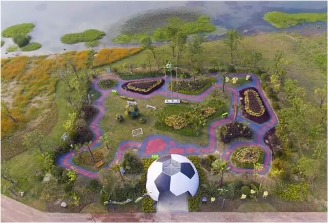 以热带风情植物为主,结合巴西特色小品来塑造异域化的景观空间。乔木和灌木的使用以及与低矮的植物种植在园林中,将视线引向上方。