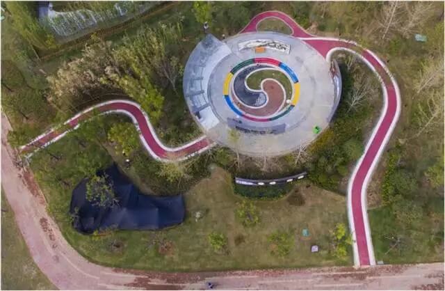 设计主题来源于韩国传统乐器太极鼓。整个园区呈现太极和鼓面的圆形,以太极文化为主线,将韩国本土民俗文化做成小品穿插其中,中间圆形小广场,形成中间低四周高的布局。