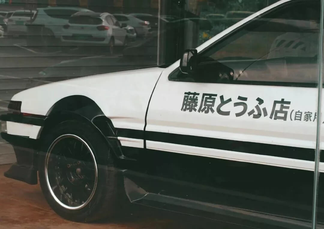 《头文字D》同款藤原豆腐店。店侧旁的招牌上还写着文太酒馆,二层楼房和门口写着「国际」字样的招牌,高度还原了电影中藤原豆腐店的模样。更有趣的是,店内真的停了一辆丰田AE86