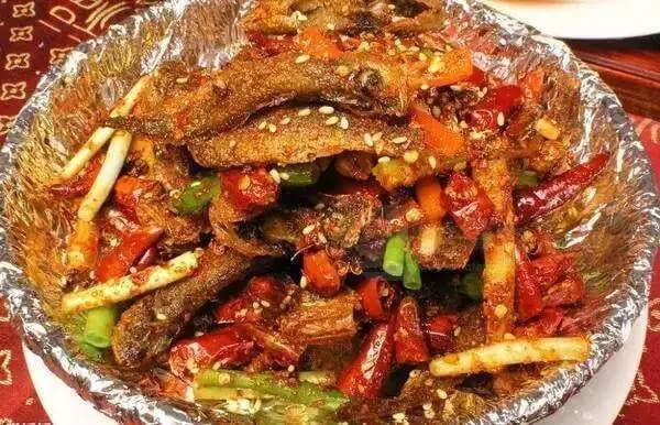 6、干煸土鱼:土鱼是当地的 淡水 鱼,干煸鱼味美肉感脆,一口咬下就可以把土鱼全身咬碎,香味十足。