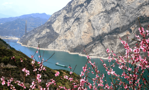 西陵峡风景区,一江春水,在桃花的映照下,更加春意盎然,微风拂过,花瓣在风中翩然起舞,令人疑是桃花源。