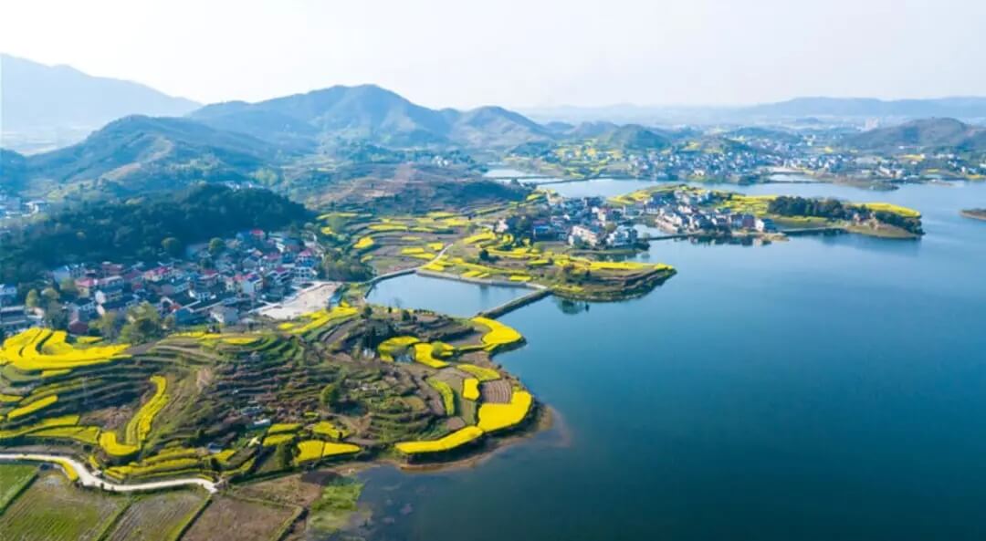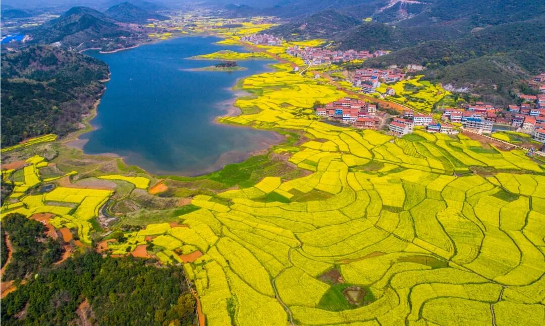 位于鄂州市鄂城区汀祖镇的石桥水库水面达2800亩,星罗棋布的村庄周围点缀着油菜花海,空中俯瞰犹如世外桃源一般。