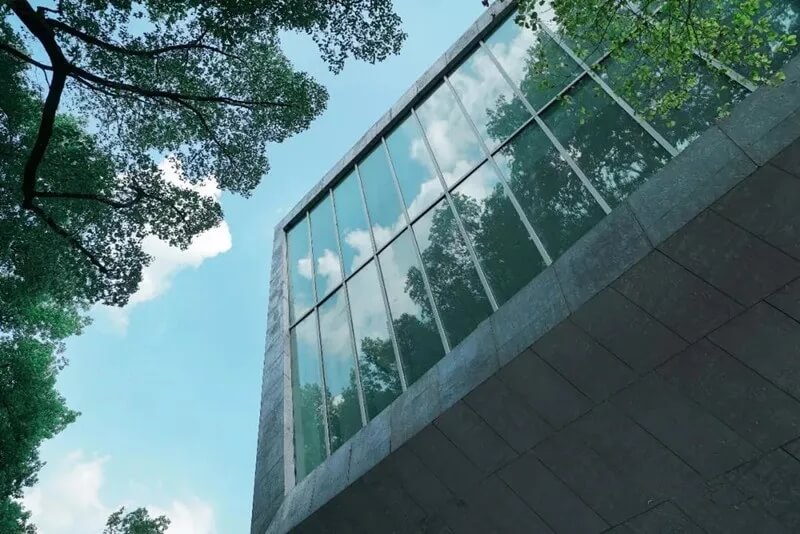 作为武汉大学内标志性建筑之一的万林艺术博物馆,建筑外立面角度十分硬朗,但是排布的玻璃却又让建筑融于自然景色之中。