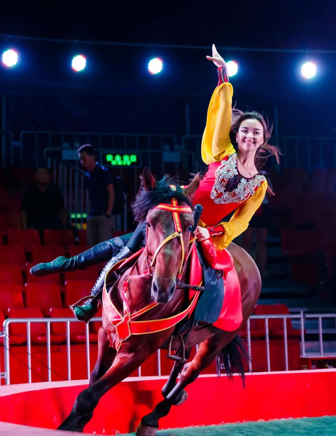 多名专业马术表演者,要完美的演出这场节目,必须要有高度的默契、平衡感、力量以及和马儿在台下多次配合训练。