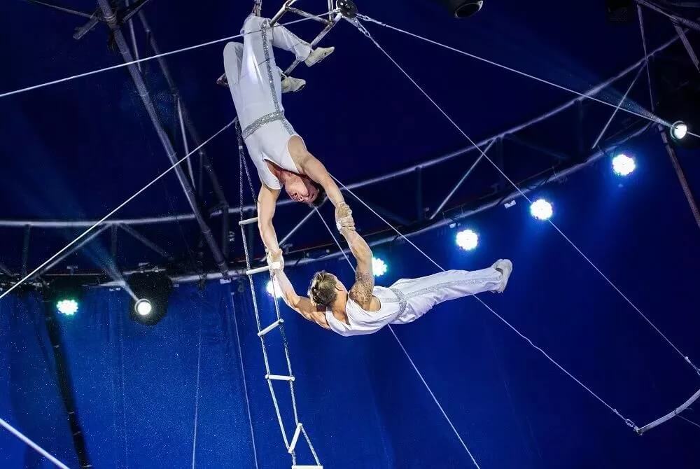 表演者在没有任何防护措施的情况下,从20多米高的秋千上飞出,在空中进行前空翻,后空翻转体180度等超高难度动作,并与对面秋千上的演员准确接手,每一个转身都扣人心弦,每一次成功接手,都引得观众连连叫好!