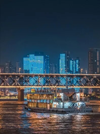 武汉两江游览(夜游长江)是游客来到武汉不可或缺的一站。乘坐游船行驶于江面上,可以将长江大桥、江滩、黄鹤楼等两岸风光尽收眼底,夜游景色更佳。