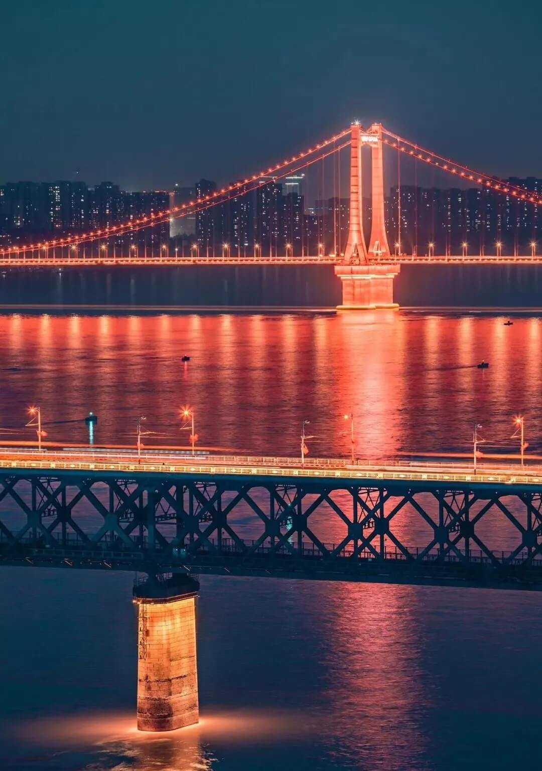 游船依次经过晴川桥、长江大桥、鹦鹉洲长江大桥,在深蓝色天幕的映衬下,3座大桥的轮廓被五彩灯光清晰勾勒。
