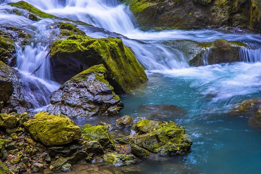 因上游有个死火山口所以水色呈现碧蓝透亮的色泽,真真是好看极了!