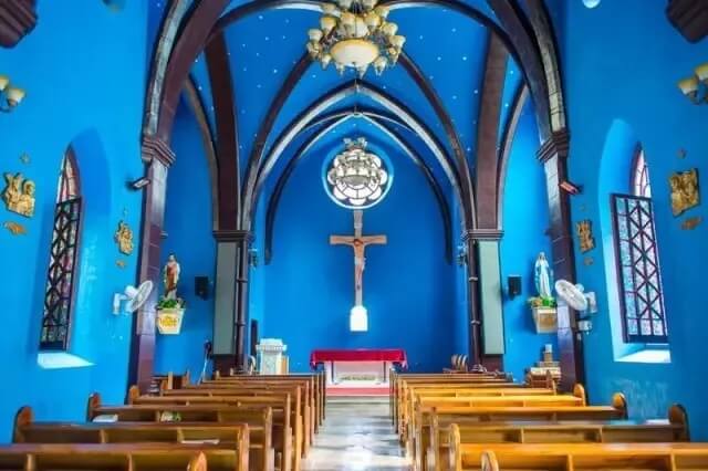汉口圣母无原罪堂位于汉口老租界区内,于1910年由法国籍神父修建,整个教堂内部都是明亮神秘的蓝色,原教堂主奉的是圣母玛利亚,而蓝色正是圣母的颜色。