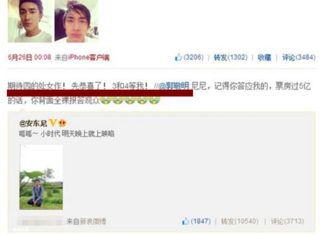 林更新转发郭敬明微博帮忙宣传,说很期待《小时代》,还自荐演出小时代续集。