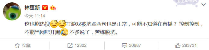 林更新本人也出来澄清说打游戏被骂很正常,大不了以后好好练技术,成了大神就没人骂了。