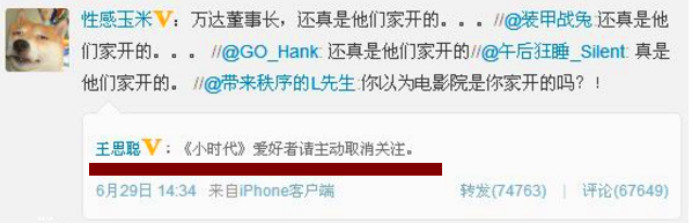 没想到王思聪不但没帮着林更新灭夏河,反而在微博宣布:《小时代》爱好者请主动取消关注。