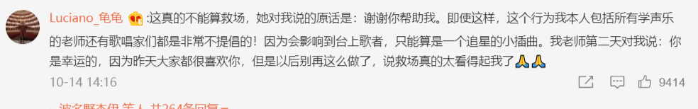 对于这次美丽的小意外,刘建伟在微博上谦虚地表示:这真的不能算救场,她对我说的原话是:谢谢你帮助我。即使这样,这个行为我本人包括所有学声乐的老师还有歌唱家们都是非常不提倡的!因为会影响到台上歌者,只能算是一个追星的小插曲。