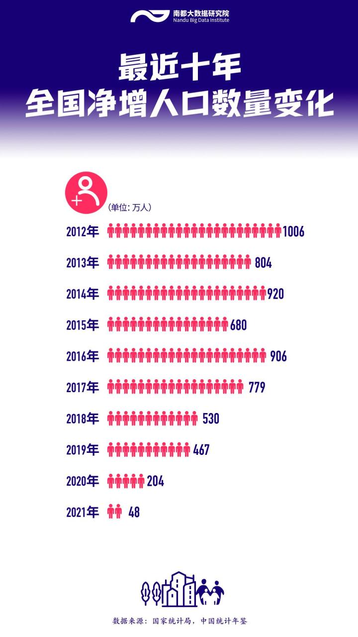 统计数据显示,2021年,全国人口仅增加了48万人,比前一年少增长了150多。而九年前的2012年,人口增长则超过了1000万人。也就是说,十年之间,全国净增人口数量减少了95.23%。从全面二孩政策实施后的变化来看,2016年的净增人口达到了906万人,随后几年,年净增人口不断下降,2017年至2021年分别为779万人、530万人、467万人、204万人和48万人。这也意味着,相比五年前,2021年的净增人口数量同样减少超过九成。