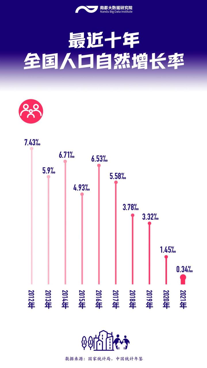 据国家统计年鉴,最近10年,全国正常的人口死亡率都在7‰以上,如果出生率持续下降,人口自然增长率就随之下降,人口负增长也即将到来。数据显示,2021年的全国人口自然增长率仅为0.34‰,而前一年还保持在1.45‰,更早之前的2012年则高达7.43‰。