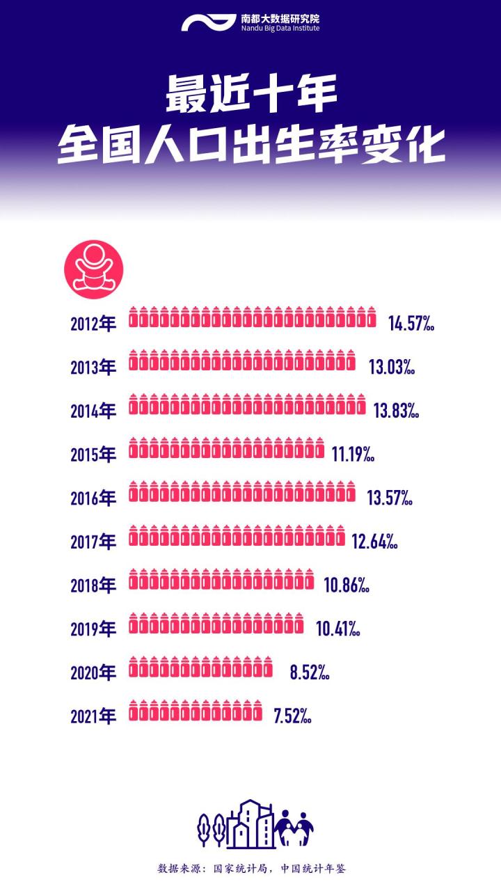从2012年开始,全国人口出生率呈现什么样的变化趋势?南都大数据研究院整理了相关数据。