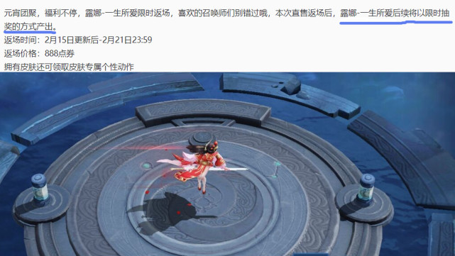 除了孙策的新皮肤预上架商城外,露娜的一生所爱也是在此次更新中进行了返场,同时官方也说明了这也将是这张皮肤最后一次以直售的形式进行返场,如果有喜欢玩露娜的玩家也千万不要错过这最后一次直接购买的机会,毕竟这款皮肤确实是目前露娜最好用的皮肤