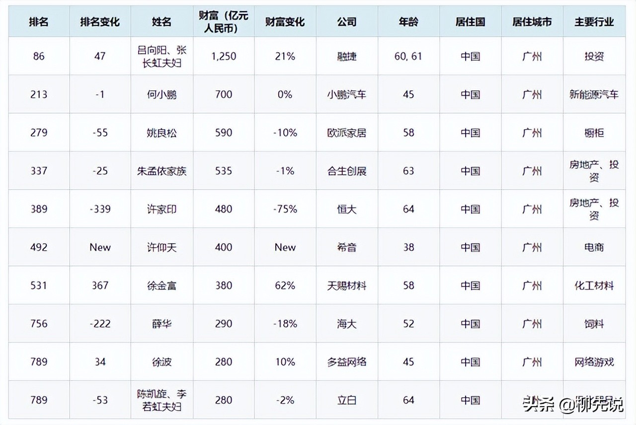 广州富豪榜第6名是38岁的许仰天,身价400亿元。创办的希音(SHEIN),是一家全球领先的快时尚电子商务公司。在广州、新加坡、洛杉矶及其他主要市场设有运营中心,商品涵盖服饰、鞋履、美妆、家居等多种品类;恒大集团创办人许家印排在广州第5名,身价480亿元,同比下滑了75%。集团旗下拥有恒大地产、恒大新能源汽车、恒大物业等八大产业。恒大地产在全国280多个城市拥有1300多个项目,恒大汽车的目标是到2025年实现年产销超百万辆。