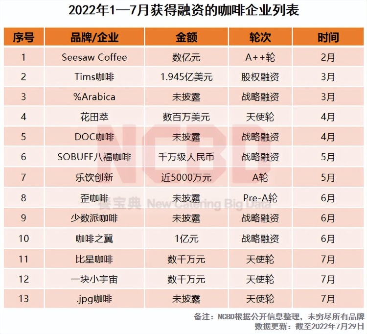 像% Arabica一样拿到大额融资的咖啡品牌还有很多。据NCBD(餐宝典)的不完全统计,今年前7个月,共发生了13例咖啡企业融资事件,在已披露金额的8例融资中,融资额达到千万元的有7例,其中过亿的有3例,最高的是Tims的1.945亿美元股权融资。