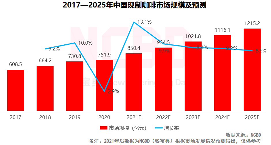 NCBD(餐宝典)的《2021—2022年中国餐饮行业投融资报告》显示,2021年中国现制咖啡市场规模达到850亿元,预计2025年将突破1200亿元。