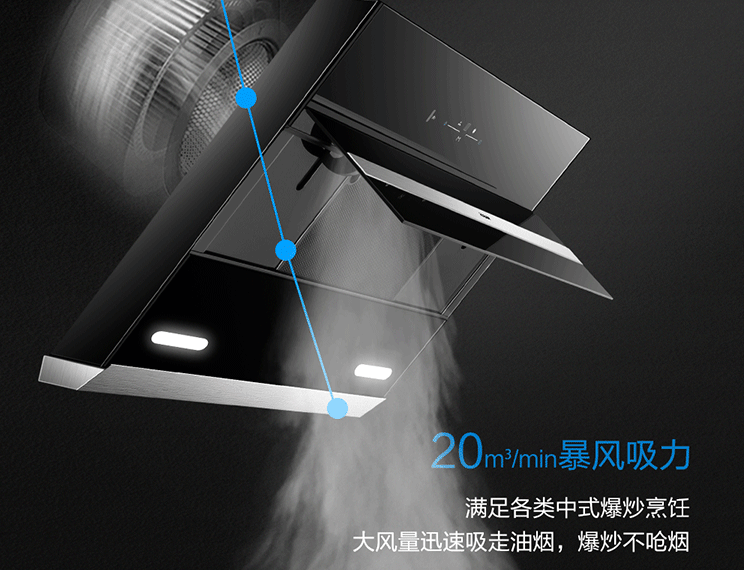 - 20m³(m3/min)的排风量不错的,吸力足够,还有爆炒档,吸力无死角,爆炒家庭也能用