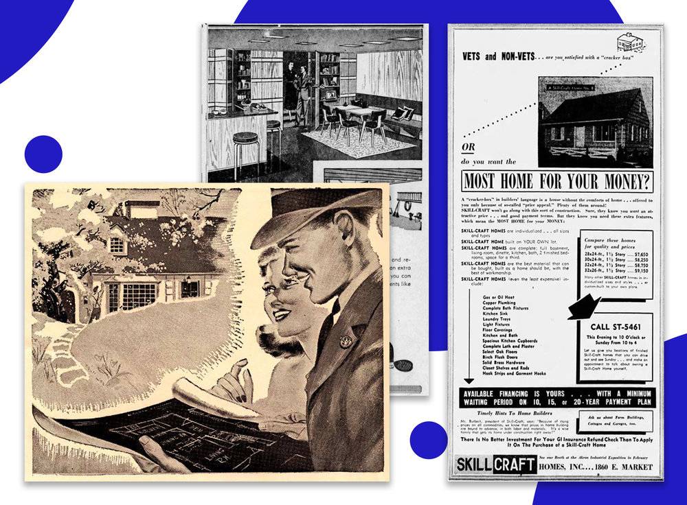 左侧的海报展示的是一位刚得到政府优惠贷款的退伍军人和他的妻子看着房屋图纸,梦想着未来新家。