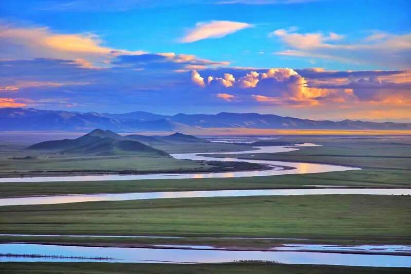 被誉为"宇宙中庄严幻景"的黄河九曲第一湾,清澈的河流水势平缓,蓝天白云,绿草繁花,帐篷炊烟,牛羊骏马,盘旋的雄鹰,如诗如画,气象万千。