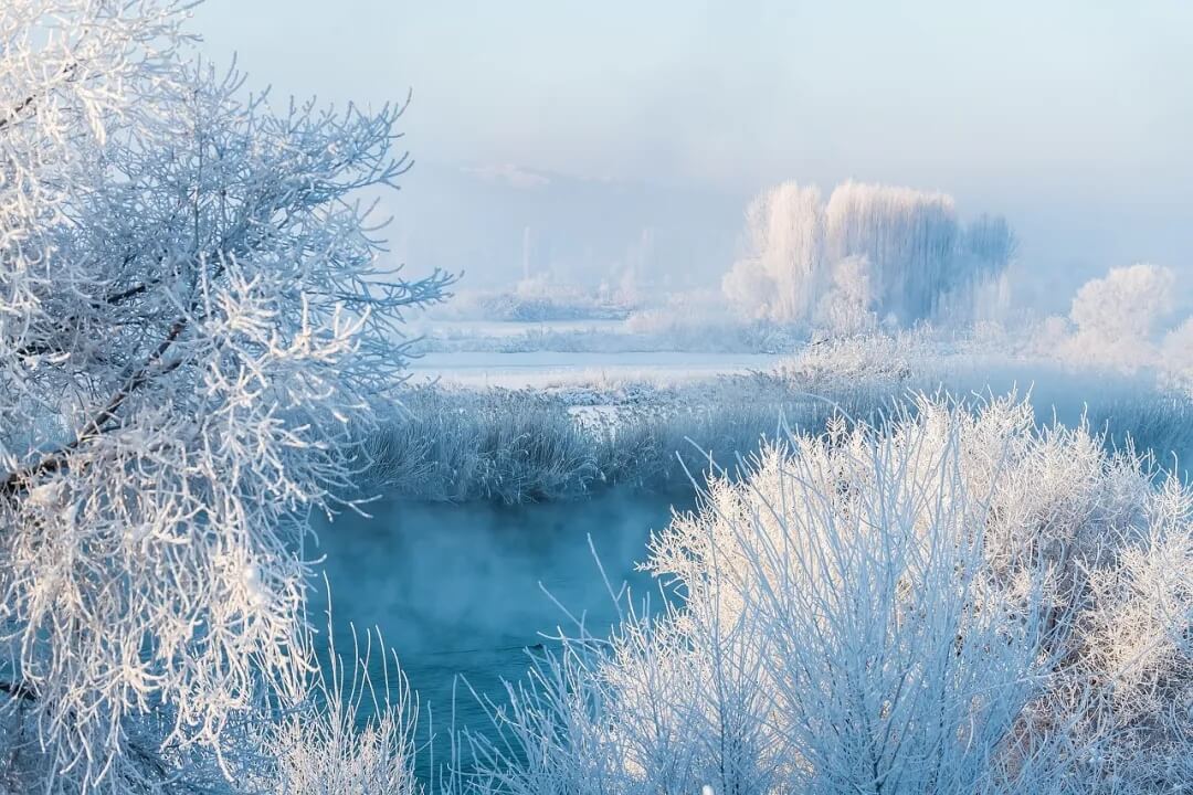 独特的气候环境和水汽,使得冬季的天鹅泉烟波浩渺,雾淞笼罩。