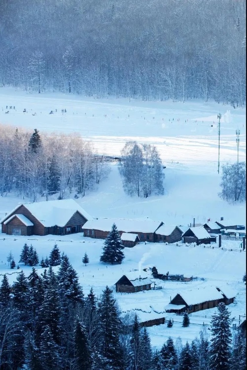 蓬松的粉雪,犹如落在村居木屋房顶上的棉花糖;屋檐下挂起了冰挂串成的晶莹珠帘;盖着雾凇的树枝牵手并肩,连出了茫茫无涯的林海雪原;
